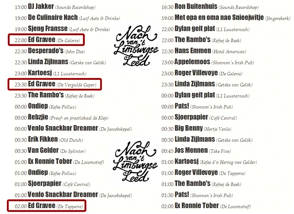Programma tijdens de "Nach van ut Limburgse leed" in Venlo op zaterdag 21-09-2013